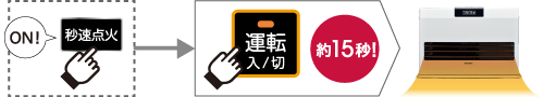 あらかじめ秒速点火キーを押しておくとスイッチONから約15秒で点火。帰宅時の冷えきった身体もすぐに温まるうれしい機能!